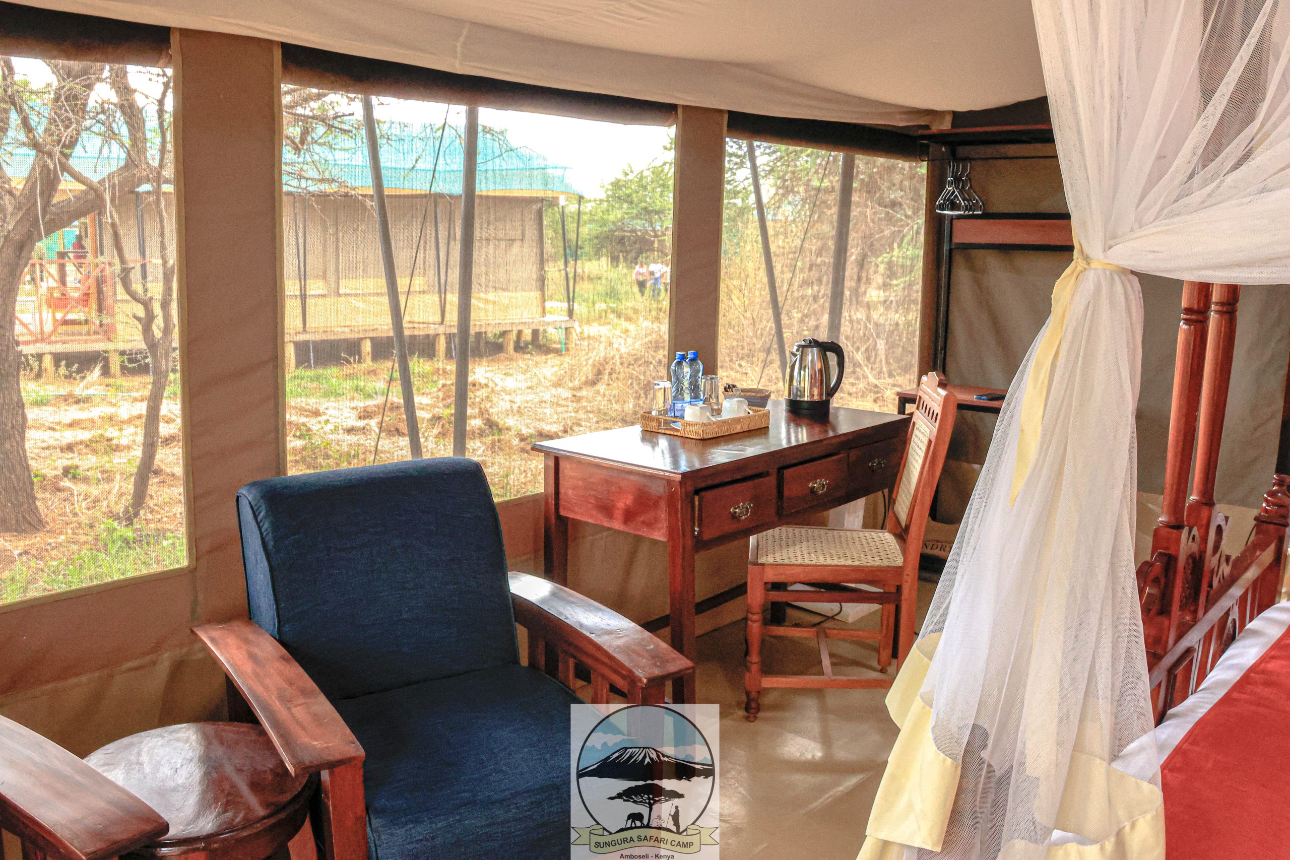 Luxury under canvas, elevated above the bush. Spacious interiors with handcrafted wooden furniture. Four-poster beds draped with soft mosquito nets. Private verandahs perfect for morning coffee or wildlife viewing. Ensuite bathrooms with rainfall showers. Double-roof cooling system for comfort in warm Amboseli days. Ideal for couples, families, and friends.